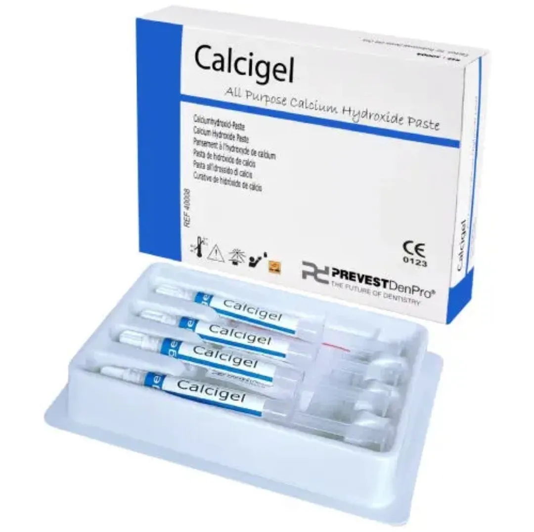 Calcigel Product Description: Ready to use radiopaque, pre-mixed, calcium hydroxide paste with barium sulphate. Calcigel is a creamy paste used as a liner or as a temporary dressing. Owing to its high alkalinity (pH12).Calcium Hydroxide neutralize the free acids of the obturating cements and of the restorative materials. It reduces the hypersensitivity of the dentine and helps the neoformation of secondary dentine.